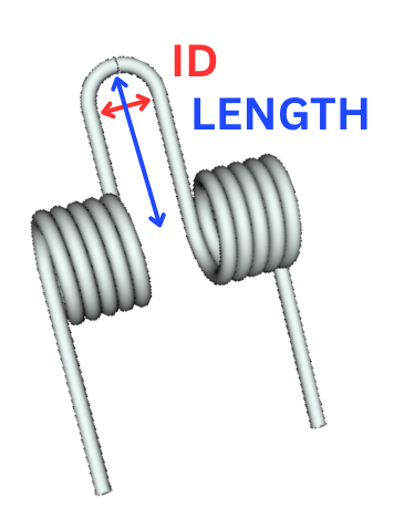 After determining the working torque your double torsion spring must withstand, you can shop for standard torsion springs by the required spring rate to evaluate the other geometric properties needed to accommodate such torque control, such as the Wire Diameter and Outer Diameter (referred to as Body Diameter in torsion springs). The double torsion spring’s Hairpin Length defines the length of the bridge or curved portion of wire that connects the two bodies of the torsion spring (called the hairpin), as it extends outward perpendicularly from the center of the torsion spring axis. Conversely, the double torsion spring’s Hairpin Inner Diameter (ID) is the width of the hairpin as measured parallel to the main axis of the torsion spring coils.